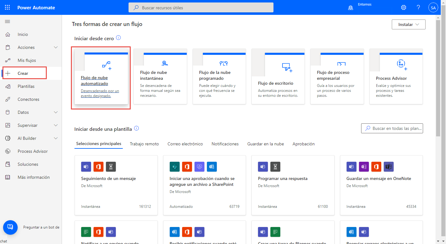 En Estudio de Power Automate, en el menú de navegación izquierdo, seleccione Crear y luego seleccione el icono Flujo de nube automatizado.