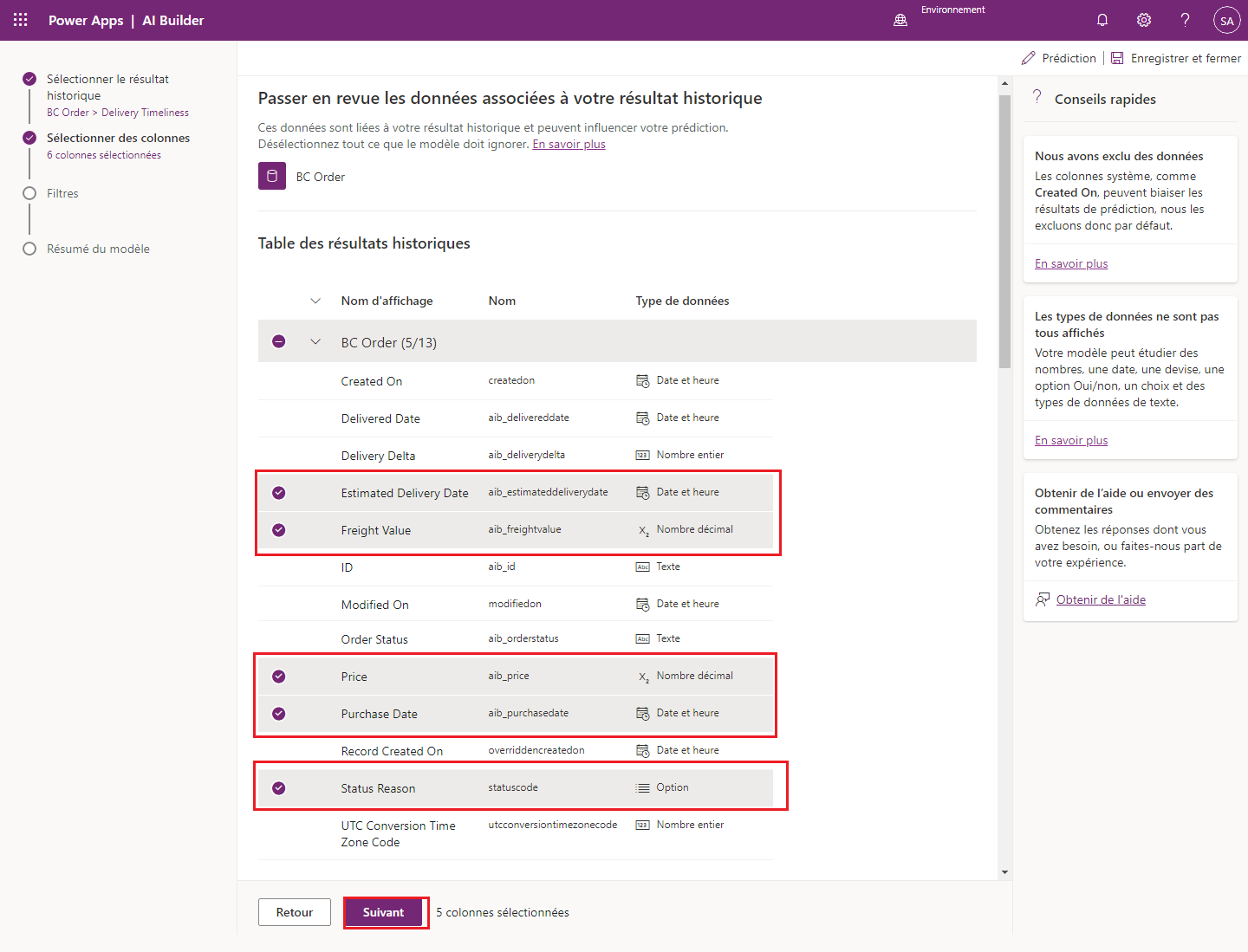 Revise y confirme las columnas seleccionadas que podrían influir en el resultado de la tabla Pedido de BC. Observe que Delta de entrega y Fecha de entrega no se han seleccionado. Estos valores se actualizan después de que se haya producido la entrega y sesgarían el análisis, lo que daría como resultado un rendimiento del modelo de tipo D. También puede eliminar otras columnas irrelevantes para el entrenamiento de este modelo, como Id. y Estado del pedido. Para pasar al siguiente paso de este ejercicio, seleccione Siguiente.