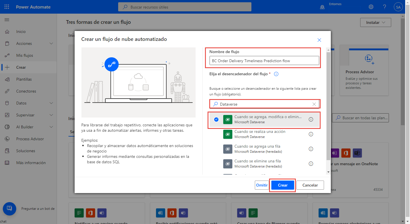 Escriba un nombre para el flujo y seleccione el desencadenador Cuando se agrega, modifica o elimina una fila para Dataverse. Seleccione Crear.