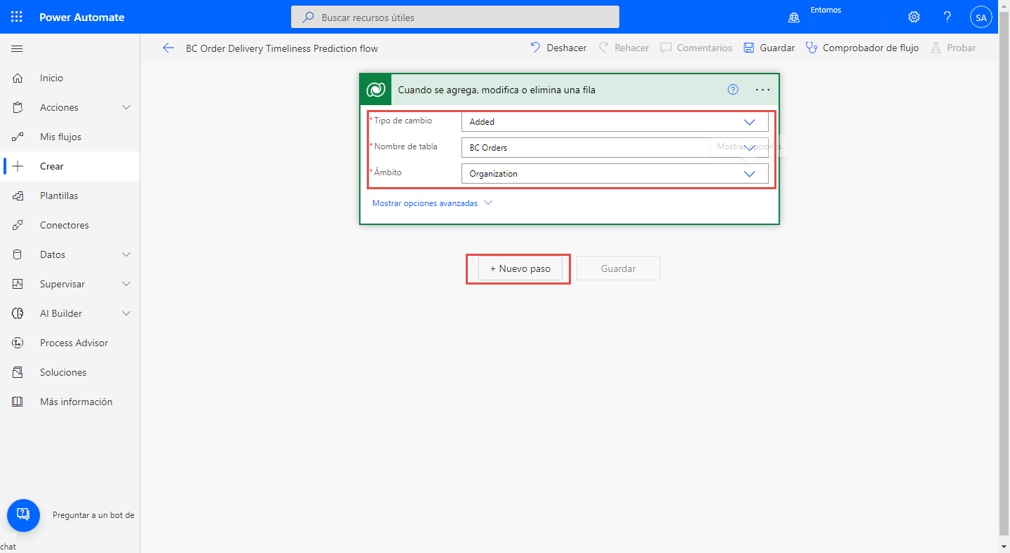 Cuando se publica un modelo de predicción, se ejecutará automáticamente para actualizar el resultado de los registros recién creados, que es diario de forma predeterminada. En escenarios donde la predicción se requiere instantáneamente, se necesita un flujo de nube de Microsoft Power Automate para generar el resultado a medida que se crean las filas. Siga estos pasos para crear un flujo que utilizará el resultado del modelo personalizado para predecir el potencial de la escala de tiempo de entrega para nuevos pedidos: