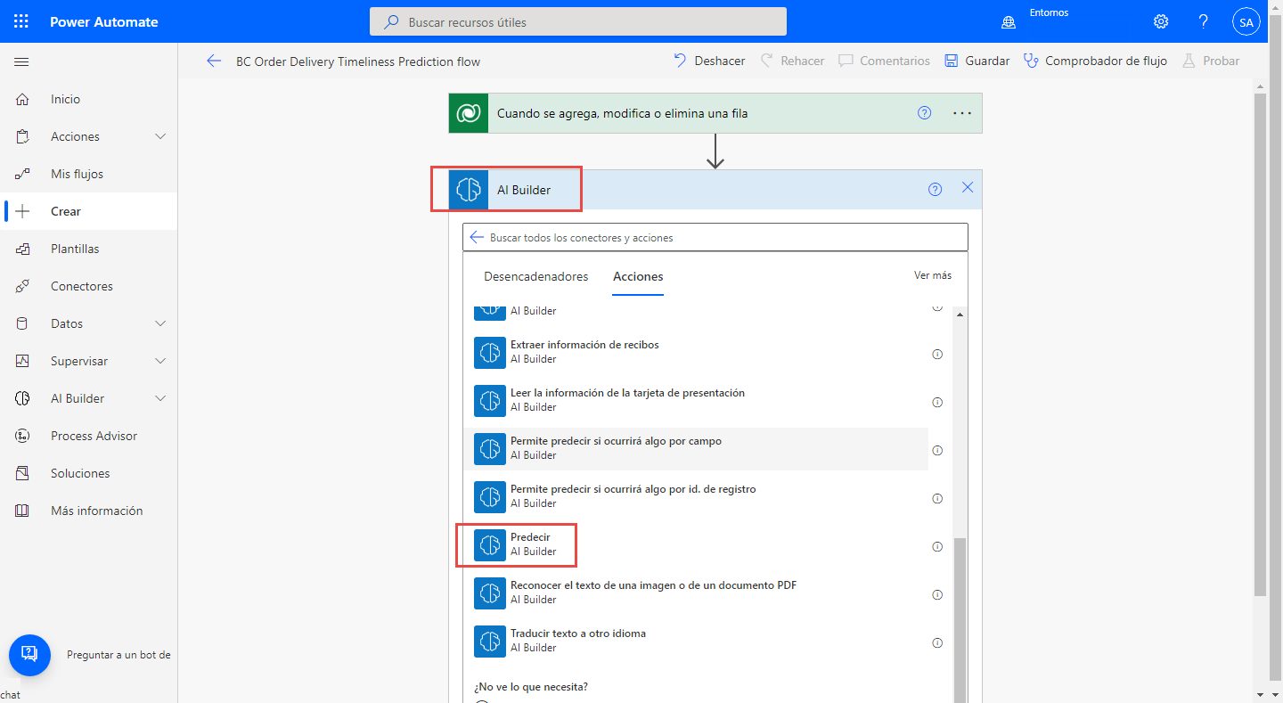 Para el conector de AI Builder, seleccione la acción Predecir.