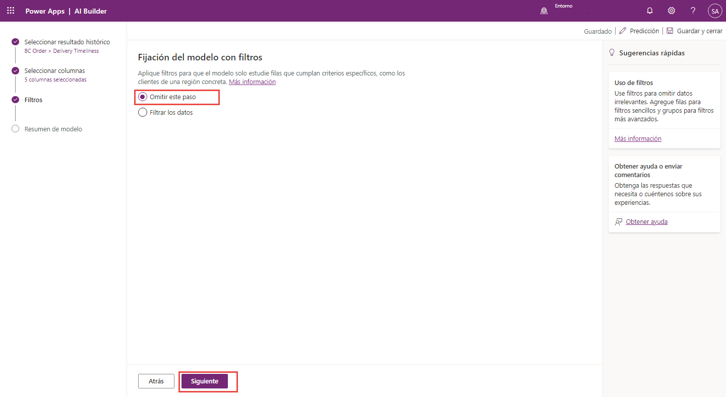 Para este ejercicio, no se requieren filtros. Seleccione Omitir este paso > Siguiente.