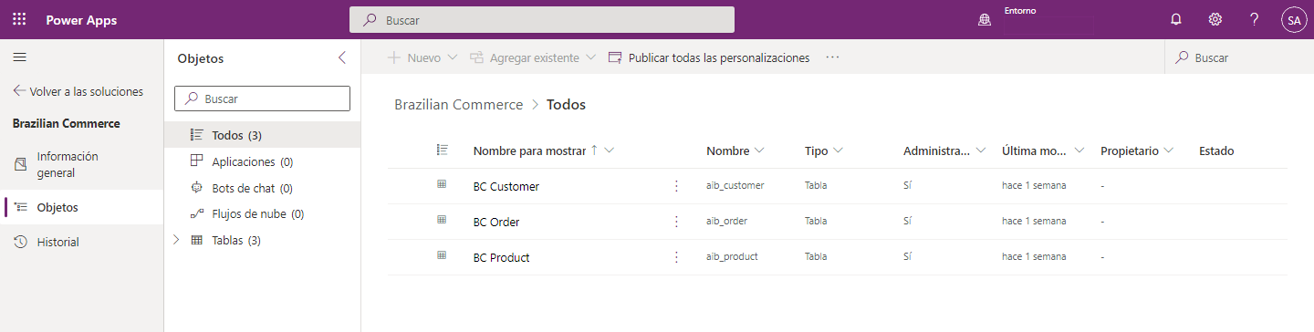 Para este ejercicio, hará referencia a las siguientes tablas, que forman parte de la solución de Dataverse para el Comercio brasileño (BC):