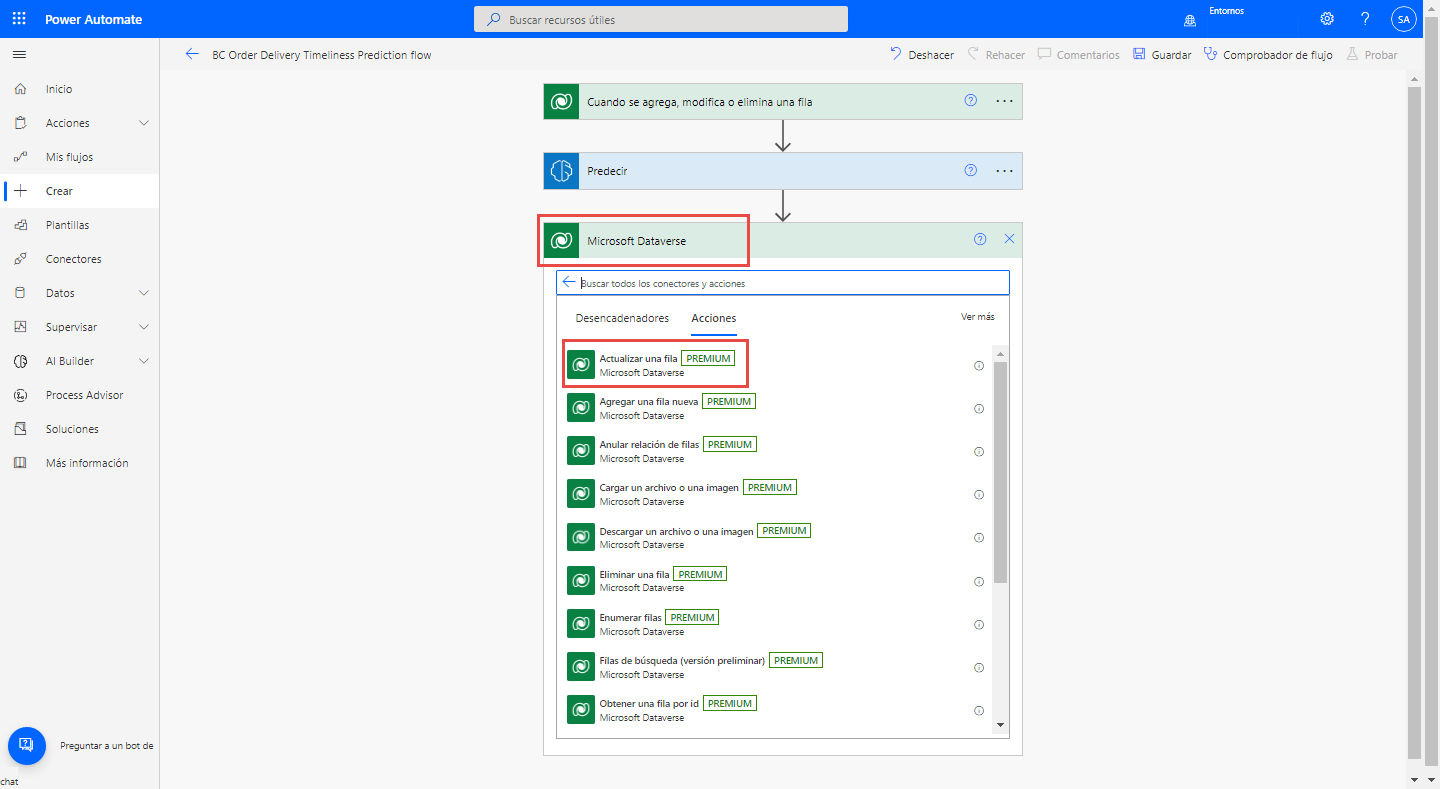 Ahora ha creado con éxito un modelo de predicción. Además, ha creado un flujo de nube de Power Automate que genera el análisis de resultados cuando se agregan nuevas filas a la tabla Pedido de BC.