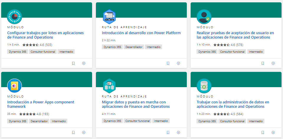 Si filtra por Business Central, el rol de desarrollador y las rutas de aprendizaje, verá las rutas de aprendizaje para desarrolladores disponibles.
