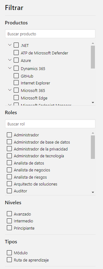 Puede filtrar por producto, rol y otros valores desde el menú del lado izquierdo. También puede filtrar por tipo, que puede ser módulos o rutas de aprendizaje.