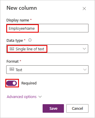 EmployeeName: columna de línea de texto única. En este escenario, utilizará una columna para almacenar el nombre completo del empleado. La mayoría de las bases de datos utilizan columnas separadas para almacenar el nombre, el segundo nombre y los apellidos. Para simplificar, utilice solo una columna.