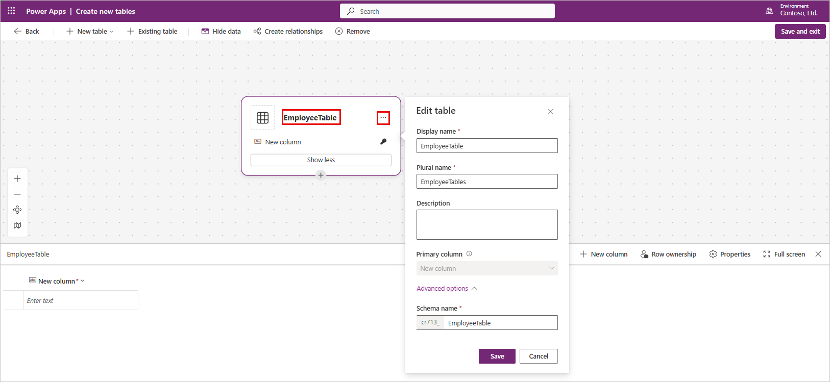 EmployeeTable.Ahora, veamos algunas de las propiedades definidas por Dataverse. Seleccione los puntos suspensivos en la parte superior derecha de la nueva tabla para mostrar estas propiedades.