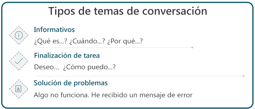 Finalización de tareas: estos temas ayudan al cliente a lograr un objetivo. Suelen desencadenarse con afirmaciones como "Quiero" o "¿Cómo hago?", por ejemplo, "Quiero programar una cita de servicio".