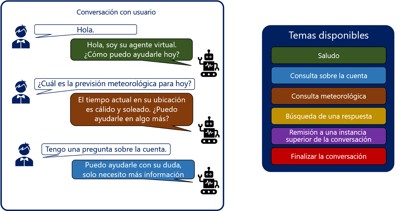 En Microsoft Copilot Studio, los temas representan las rutas por las que el sistema puede dirigir a un cliente mientras interactúa con un agente. El tema que se usa y la ruta que se sigue dentro de un tema individual dependen de la respuesta a los datos que escriben los clientes en el panel de conversación. Los temas son los elementos principales que dictan cómo fluyen las conversaciones. Si un cliente pregunta sobre el clima, el agente puede lanzar un tema del clima. Para proporcionarle la previsión meteorológica correcta, el agente puede hacer preguntas definidas en el tema, como en qué ciudad vive el cliente. El agente retiene esa información para que pueda enviarse a un servicio meteorológico para obtener detalles del pronóstico. El agente puede devolver la previsión al cliente en un mensaje personalizado que incluye información pertinente del cliente.