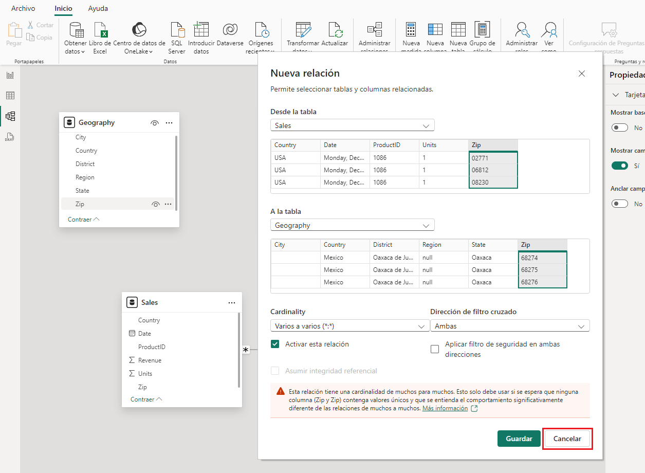 Actualmente no existe ninguna relación entre las tablas Sales y Geography, por lo que necesita crear una: