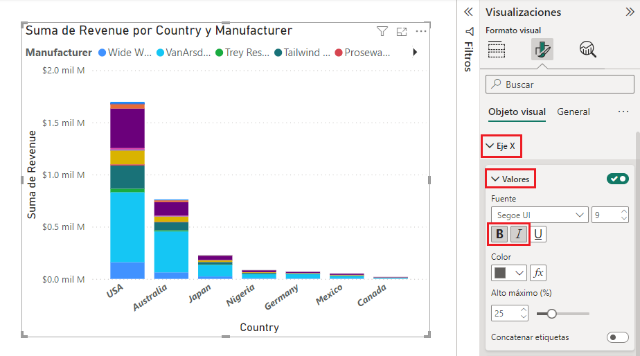 Observa que el objeto visual se filtra para mostrar los cinco primeros fabricantes por Suma de Revenue. El fabricante VanArsdel, Ltd. tiene un porcentaje de ventas superior en Australia, en comparación con otros países o regiones.