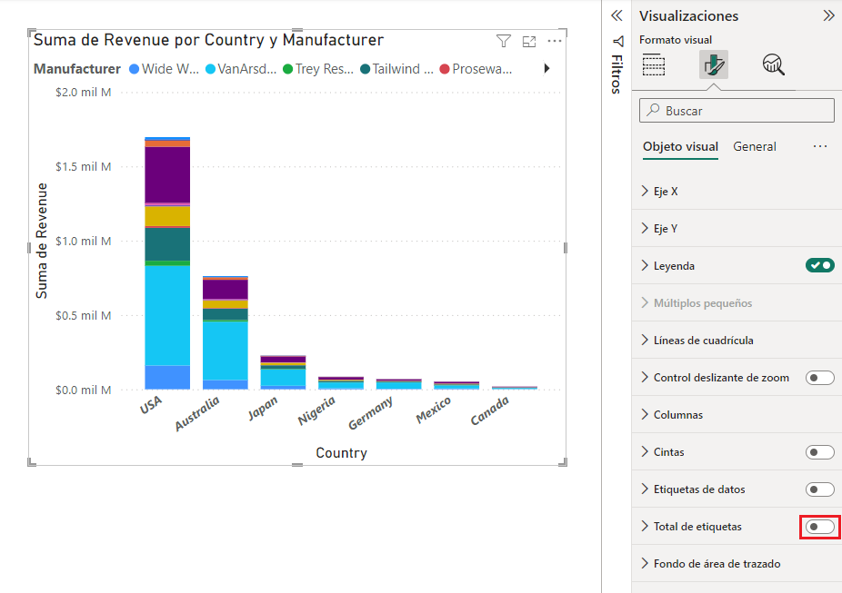 Si lo desea, ahora puede contraer el panel Filtros hasta que lo necesite. Ahora puedes agregar etiquetas de totales a los objetos visuales apilados. Comienza con las opciones de formato de fuente.