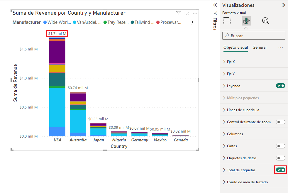 Observa el total de etiquetas que ahora aparece sobre cada una de las columnas del gráfico de columnas apiladas. Todas estas propiedades se pueden cambiar o activar/desactivar fácilmente en cualquier momento.