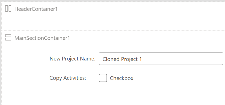 Además de las dos opciones que analizamos, una opción más avanzada es usar una Página personalizada de Power Apps como cuadro de diálogo. Cuando usa este enfoque, el botón de la barra de comandos mostraría una página personalizada y pasaría la fila para copiar como un parámetro a la página. Después, la página podría interactuar con el usuario para permitir una experiencia más personalizada para la especificación de qué valores se copiaron. La página personalizada contendría la lógica para completar la copia. La siguiente imagen muestra un ejemplo de una página personalizada que permite al usuario proporcionar el nuevo nombre del proyecto e indicar si desea copiar las actividades del proyecto anterior:
