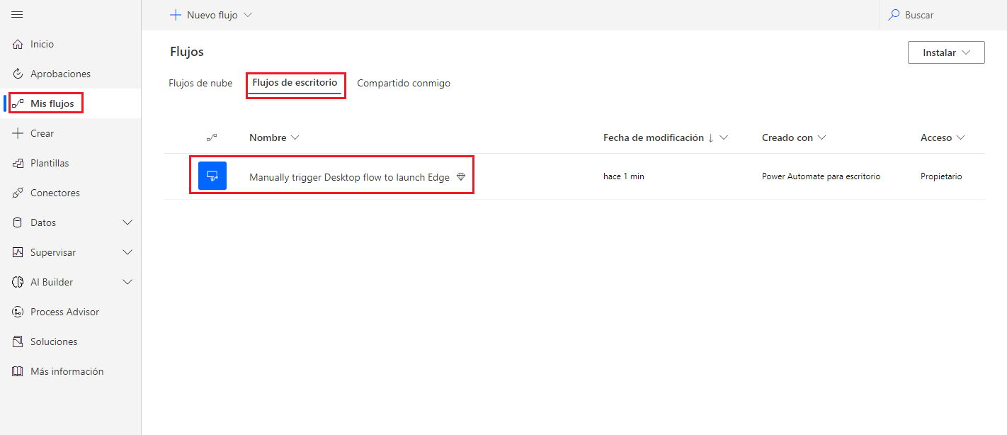 Cuando tenga una conexión desde Power Automate de escritorio a Power Automate, podrá acceder al nuevo flujo de escritorio que creó desde Power Automate Maker Portal. Desde la página principal, seleccione Mis flujos en la navegación del lado izquierdo y, luego, Flujos de escritorio.