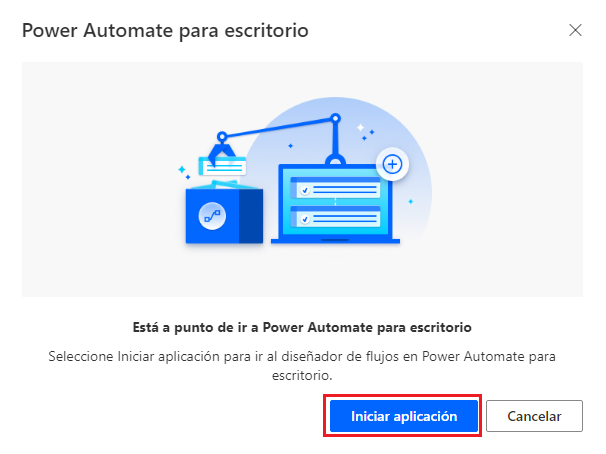 Desde aquí, puede ver el historial de ejecución seleccionando el nombre del flujo y puede seleccionar un vínculo para editarlo. La opción de edición le solicita que inicie la aplicación. Al seleccionar el botón Iniciar aplicación, se le dirigirá a Power Automate de escritorio.