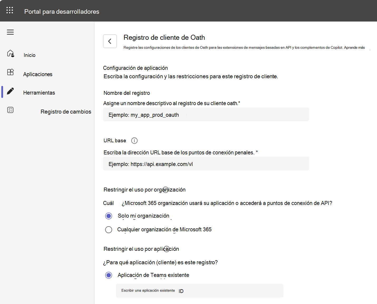 Durante el desarrollo, puede registrar la información de OAuth de desarrollo en el almacén manualmente, ya sea en el Portal para desarrolladores de Teams y en la sección Herramientas que abre el registro de cliente de OAuth o mediante microsoft 365 Agents Toolkit. En producción, normalmente un administrador registra la información de OAuth y le proporciona el identificador de la entrada del almacén que se va a usar en el complemento de API.