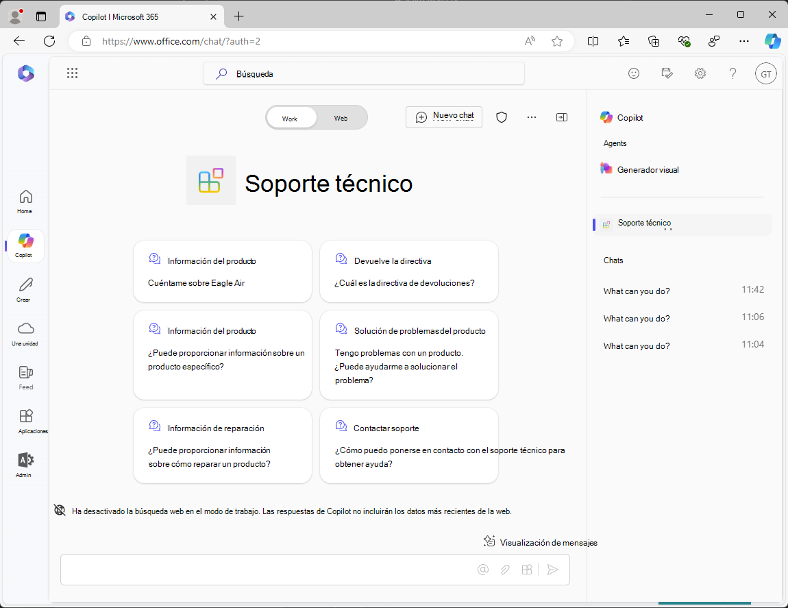 Aquí se crea un agente declarativo que puede responder a las preguntas de soporte técnico del producto mediante la información almacenada en documentos de Microsoft 365: