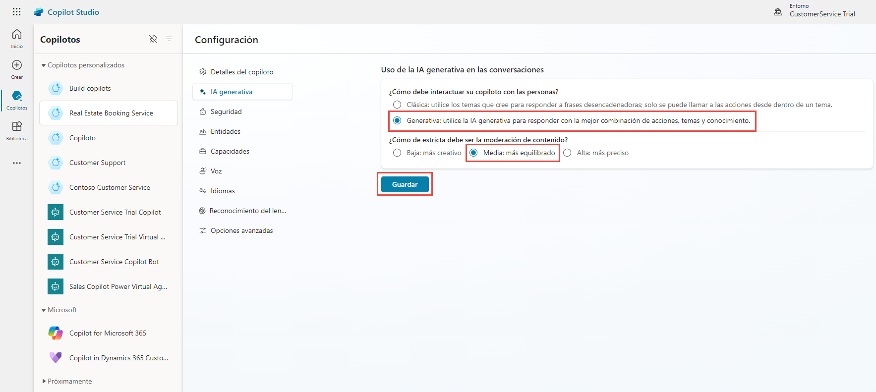 Seleccione Medio para la Moderación de contenido de Copilot.