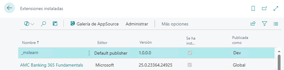 En Business Central, abra la página Administración de extensiones para comprobar que su extensión se haya publicado e instalado correctamente.