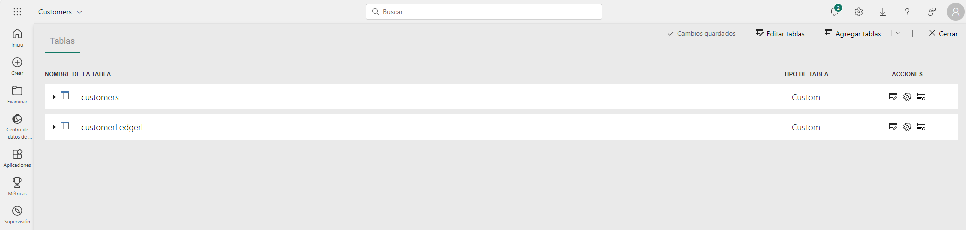 En el Navegador que se abre, abra su Espacio de trabajo y su flujo de datos. A continuación, seleccione las tablas del flujo de datos: