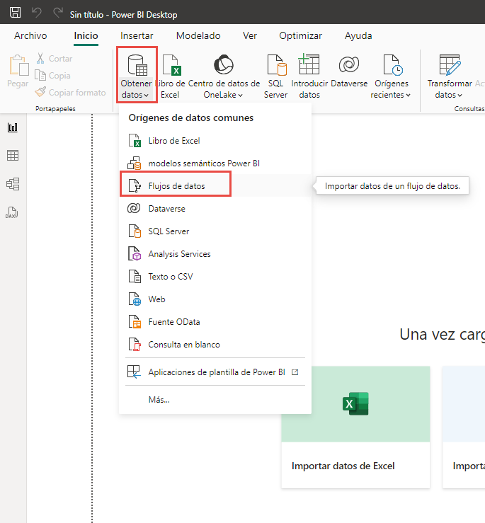 En Power BI Desktop, seleccione Obtener datos, Flujos de datos.