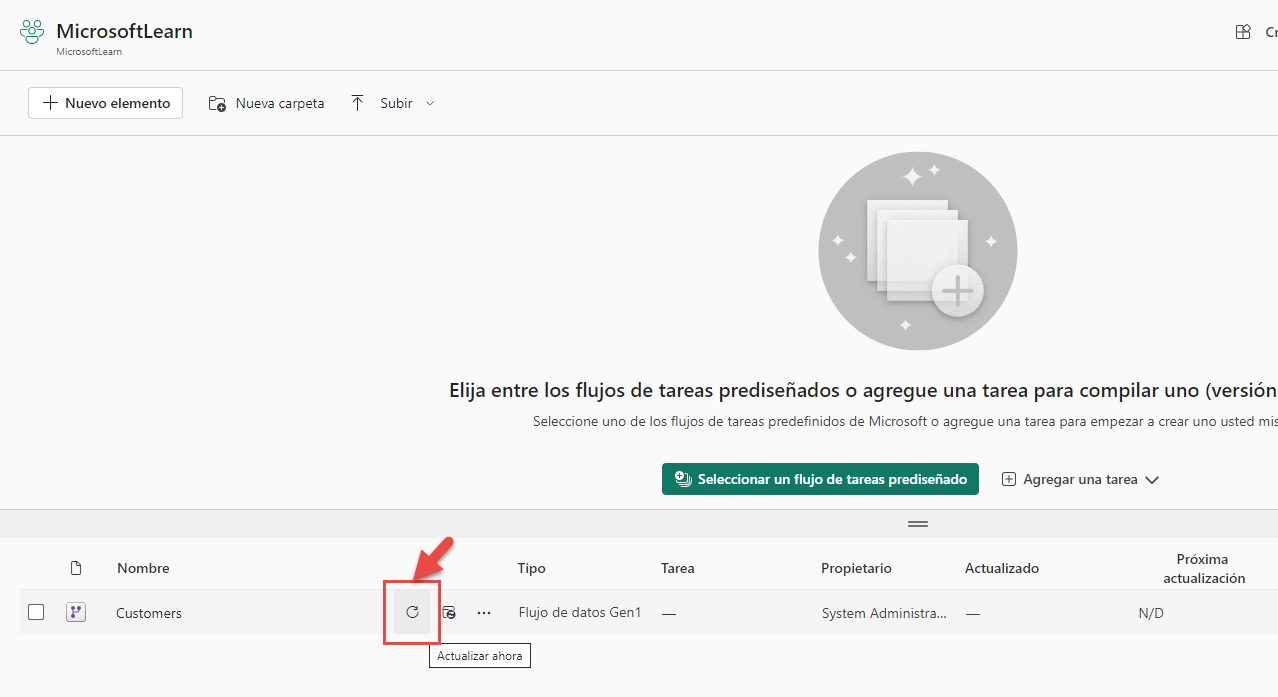 Con los flujos de datos, puede unificar datos de varios orígenes y preparar esos datos unificados para el modelado. Cada vez que crea un flujo de datos, se le solicita que actualice los datos para el flujo de datos. Es necesario actualizar un flujo de datos antes de que pueda consumirse en un conjunto de datos dentro de Power BI Desktop o hacérsele referencia como una tabla vinculada o calculada.