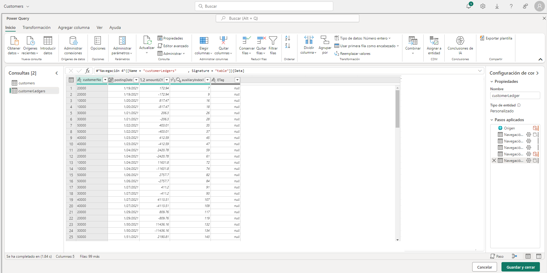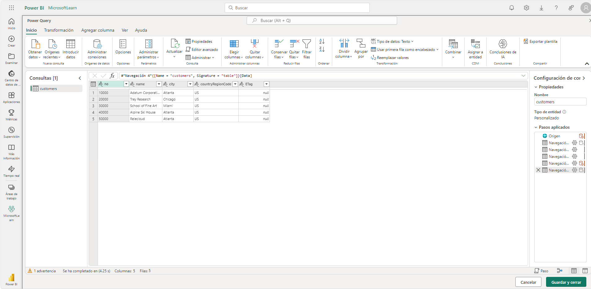 En la ventana que se abre, puede ver una interfaz típica de Power Query. Aquí puede, si lo necesita, realizar transformaciones de datos, aplicar filtros, crear nuevas columnas...