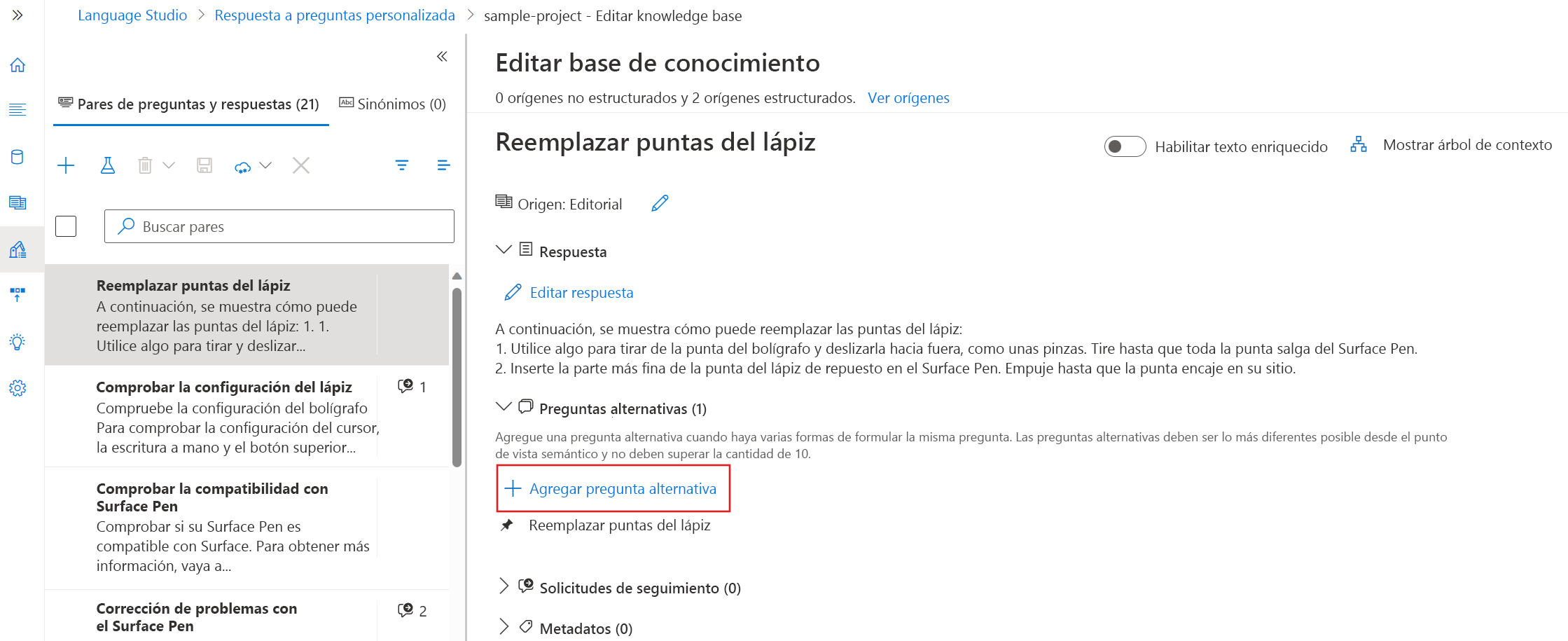 También puede agregar manualmente preguntas alternativas al seleccionar Agregar pregunta alternativa para un par en el panel Editar base de conocimiento:
