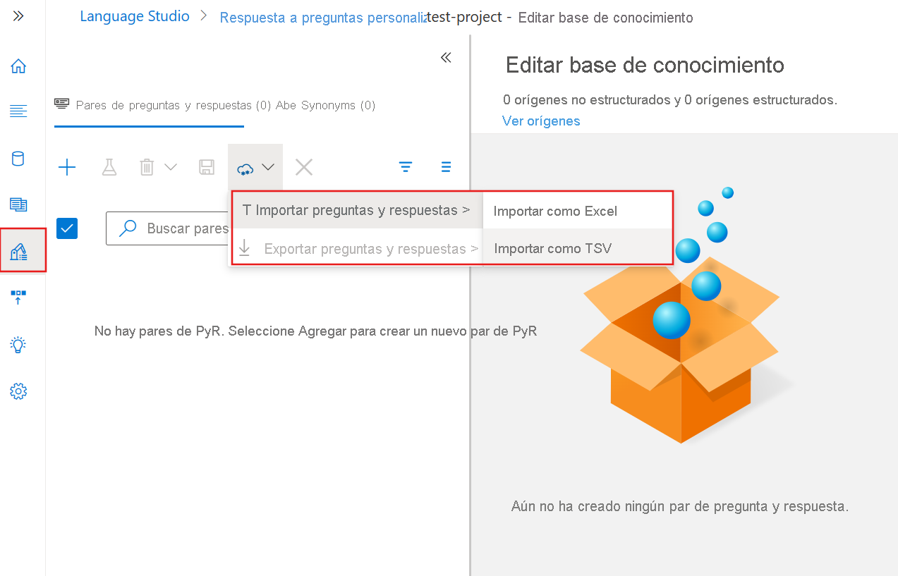 Puede crear pares de preguntas y respuestas en Language Studio para el proyecto. También puede importar un archivo que contenga pares de preguntas y respuestas para cargarlos de forma masiva.