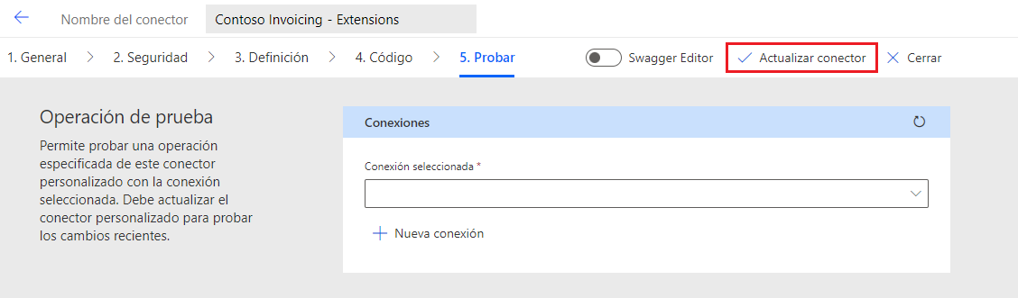 Seleccione la pestaña Prueba, seleccione Actualizar conector y espere a que finalice la actualización.
