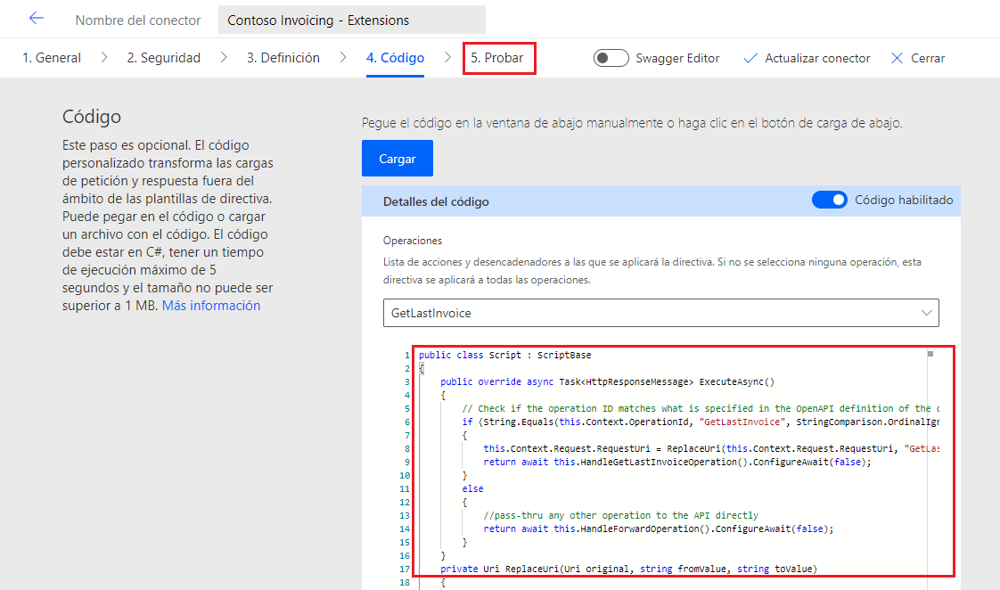 Modificará el conector personalizado Contoso Invoicing, que contiene una operación ListInvoice, pero no tiene una operación LastInvoice. Como resultado, agregará la operación LastInvoice para recuperar la factura más reciente que se haya creado. La API de red para Contoso Invoicing no es compatible con esta operación, por lo que debe usar código personalizado que se ejecute en la operación LastInvoice para redirigir la solicitud a ListInvoice en la API y, luego, transformar la respuesta para devolver solo la última factura que se haya creado.