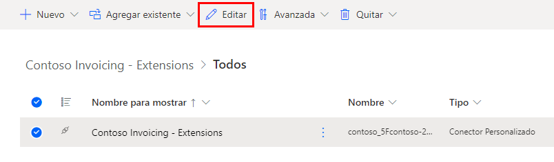 Seleccione el conector Contoso Invoicing - Extensions y elija Editar. Es posible que el conector no tenga Extensions en el nombre si lo ha creado a partir de un ejercicio diferente, pero eso no es un problema.