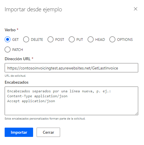 https://contosoinvoicingtest.azurewebsites.net/GetLastInvoiceen el cuadro de la URL y seleccione Importar.Desplácese hacia abajo hasta la sección Respuesta y seleccione + Agregar respuesta predeterminada.