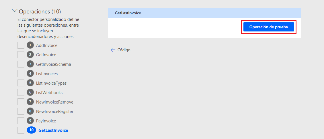 Seleccione el menú desplegable Operaciones y, luego, seleccione la operación GetLastInvoice.