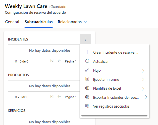 Puede agregar incidentes a un registro de configuración de reserva dirigiéndose a la pestaña Subcuadrículas y seleccionando Nuevo incidente de reserva del acuerdo en la subcuadrícula Incidentes.