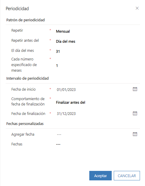 • Intervalo de periodicidad: especifique el periodo de tiempo para el patrón. El valor predeterminado son las fechas especificadas en el acuerdo, pero se puede establecer en cualquier intervalo que prefiera.