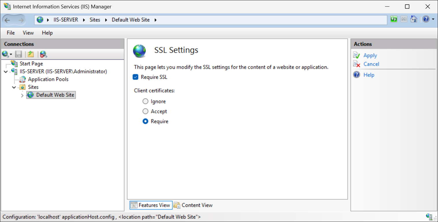 Al seleccionar el propio servidor o un sitio, el panel central se rellena con características. Estos le permiten configurar opciones como la autenticación en el nivel de servidor o la configuración en el nivel de un nivel de sitio individual. Las opciones configuradas en el nivel de sitio tienen prioridad sobre las configuradas en el nivel de servidor.
