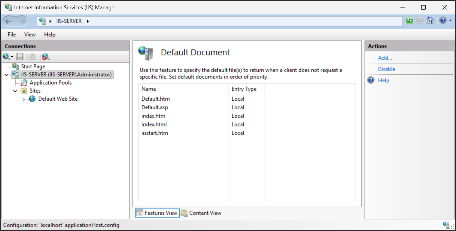 El documento predeterminado es el archivo que IIS sirve si un usuario solicita una dirección URL que corresponde a una carpeta. Por ejemplo, si un usuario va a http://yoursite/ (sin página especificada), IIS busca un documento predeterminado en esa carpeta. Entre los valores predeterminados típicos se incluyen Default.htm, Default.asp, index.htm, index.htmly iisstart.htm. En el Administrador de IIS, puede configurarlo a nivel de servidor o sitio al hacer doble clic en Documento Predeterminado. Verá la lista de archivos predeterminados. Puede agregar (por ejemplo, si la aplicación usa home.aspx como página principal, puede agregarlo), quitar o reordenar estas entradas. La lista a nivel de servidor actúa como valor predeterminado para todos los sitios, pero puede sobrescribir por sitio.