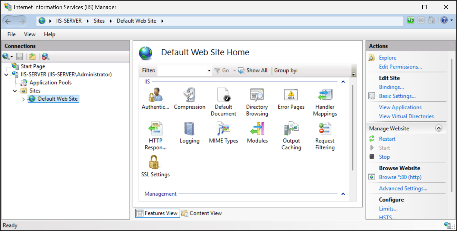 Para comprobar que el sitio web predeterminado está presente, vaya al http://localhost explorador local o vaya a la dirección IP del servidor o al nombre DNS mediante un explorador web en un host remoto. También puede probar que el sitio web está presente mediante el comando Invoke-WebRequest PowerShell.