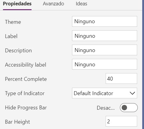 Cuando un creador configura un componente de código, las propiedades definidas en el manifiesto están disponibles para su configuración. Esta imagen muestra cómo se muestra el manifiesto anterior para un componente indicador de progreso a un creador en el diseñador de aplicaciones. Les permite ver las propiedades disponibles y personalizarlas.