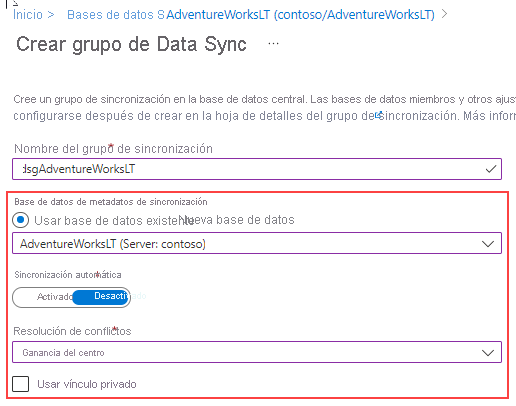 Al crear un grupo de sincronización, debe especificar una base de datos para almacenar los metadatos del grupo de sincronización. Esta base de datos de metadatos puede ser nueva o existente, siempre y cuando resida en la misma región que el grupo de sincronización.
