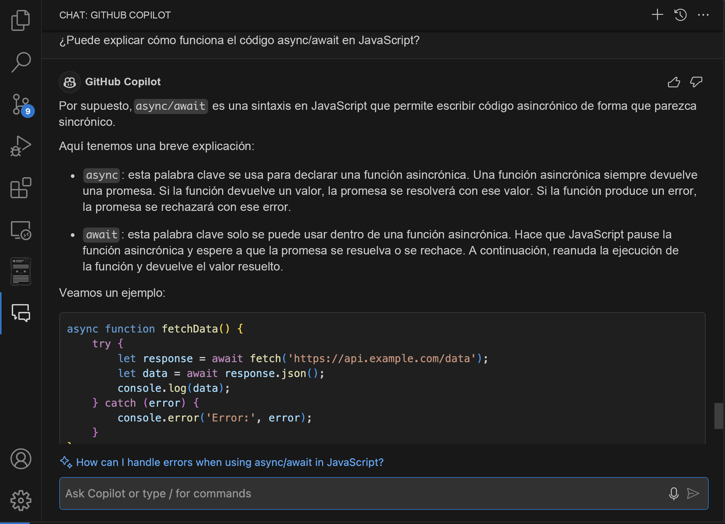 Explicaciones sobre el código El chat de Copilot también se puede usar para comprender mejor aquellos fragmentos de código que sean complejos. Puede dividir el código en términos más sencillos, explicar el propósito y la funcionalidad de código que sea desconocido y ofrecer información sobre los procedimientos recomendados y las posibles optimizaciones. Por ejemplo, podría preguntar: "¿Puedes explicar cómo funciona este código asincrónico/de espera en Python?"