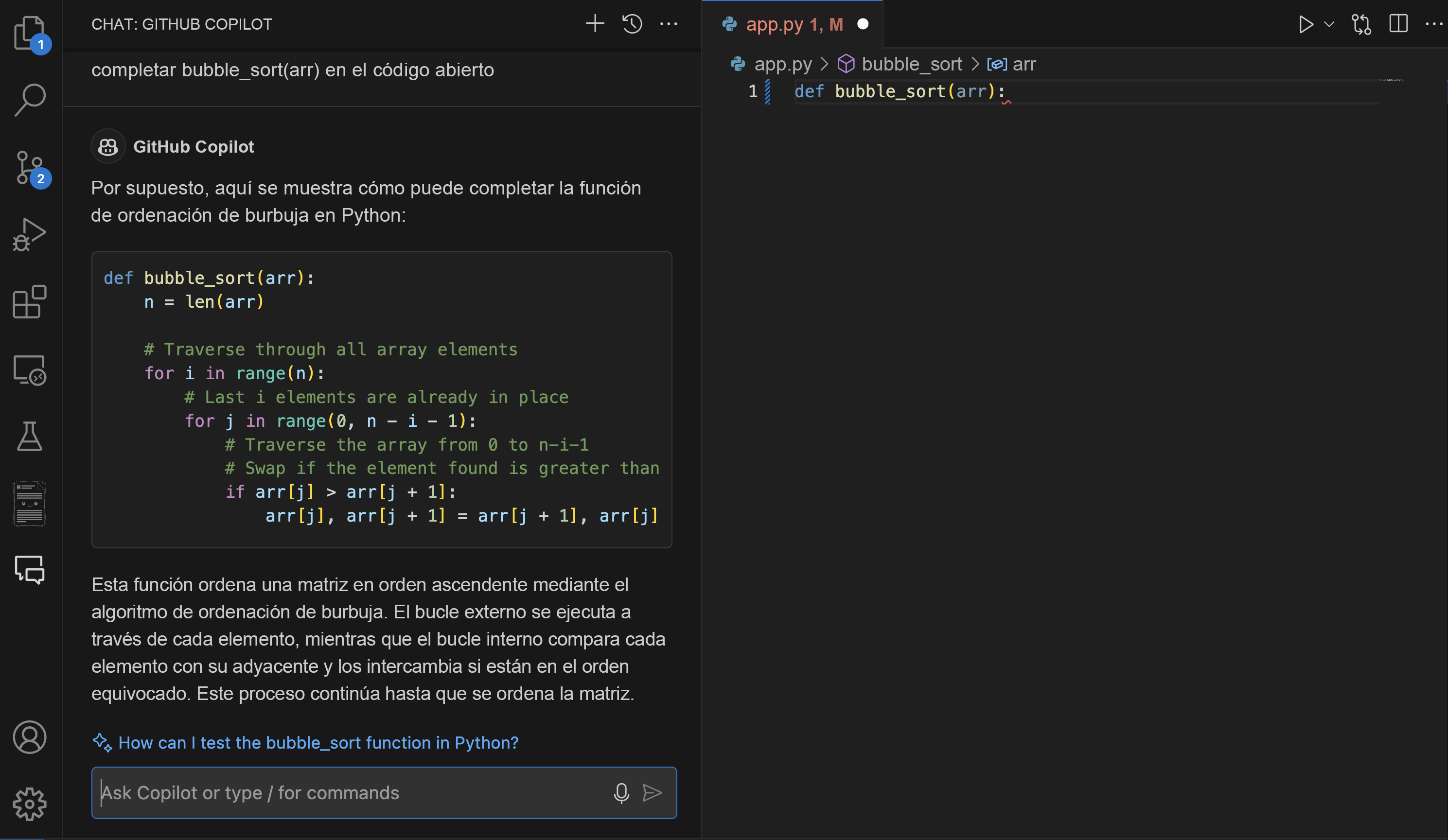 Generación de código complejo Al necesitar implementar algoritmos complejos, estructuras de datos o generar código reutilizable para patrones de diseño específicos, el chat de Copilot le ayudará a simplificar los procesos. Puede ayudar a crear expresiones regulares complejas, construir consultas SQL detalladas o desarrollar estructuras de datos avanzadas como una ordenación de burbujas en Python.