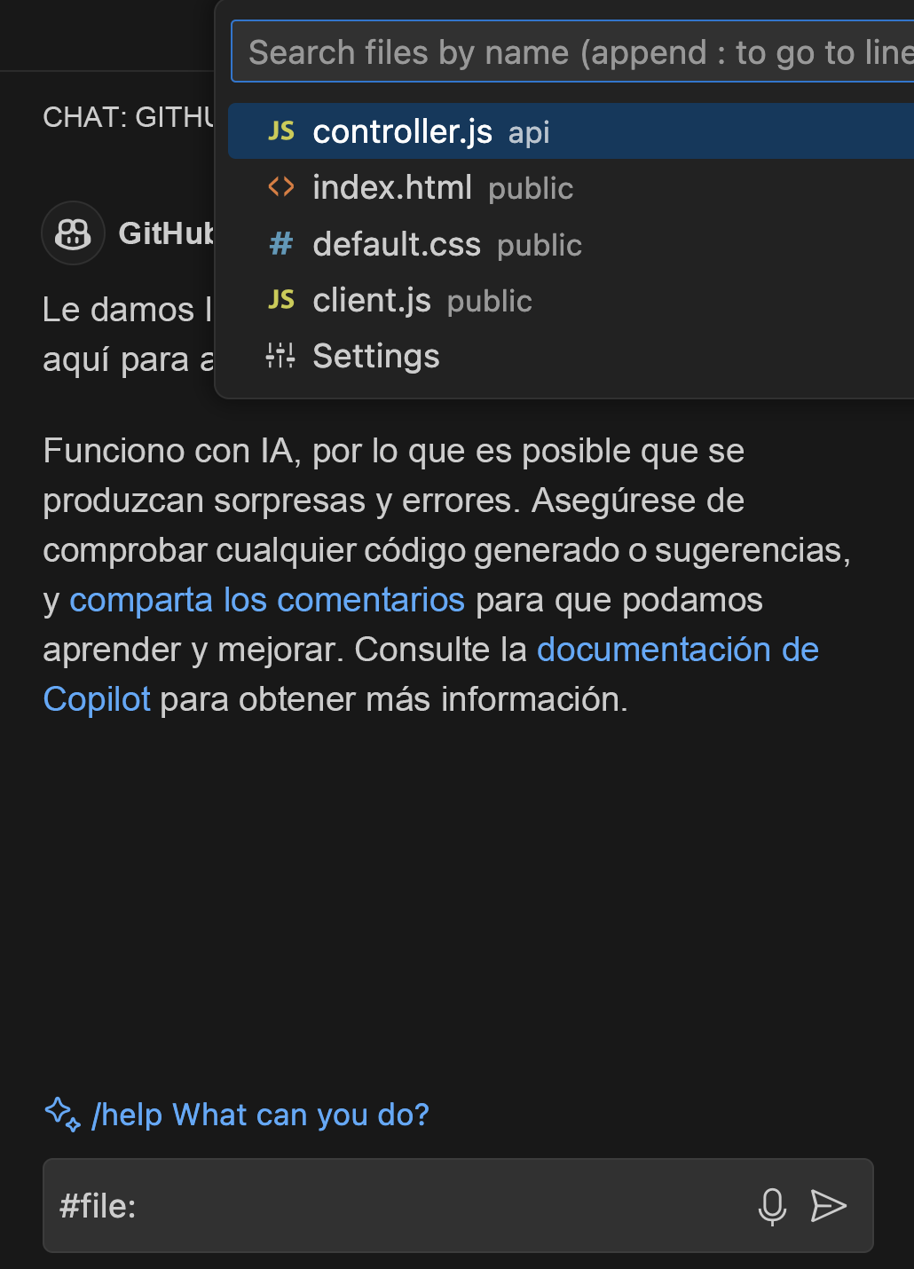 controller.js, use el comando #file para seleccionarlo y hacer referencia a el directamente en la pregunta como#file:controller.js. Esta característica indica a Copilot Chat que se centre en el contenido de ese archivo al generar una respuesta.Referencias de entorno: puede usar Copilot Chat junto con el terminal para obtener ayuda basándose en la salida del comando. Esto permite a Copilot ayudar con la depuración y proporcionar sugerencias basadas en lo que sucede en el terminal. Por ejemplo, preguntando "¿@terminal cómo se corrige este error?" permite a Copilot analizar la salida del terminal y sugerir soluciones pertinentes.