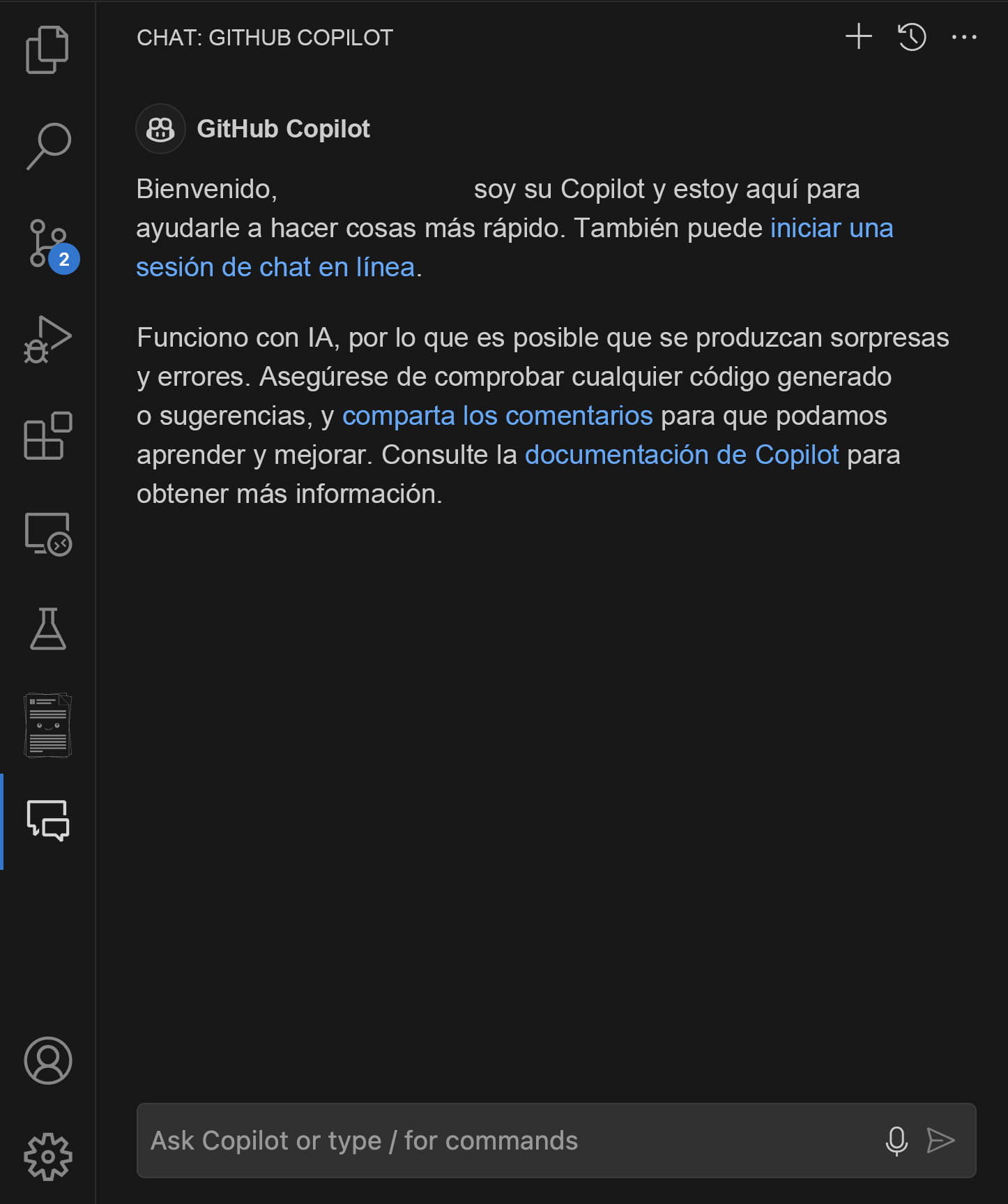 Para acceder a Copilot en su entorno de desarrollo integrado (IDE), haga clic en el icono de chat de la barra de navegación izquierda.