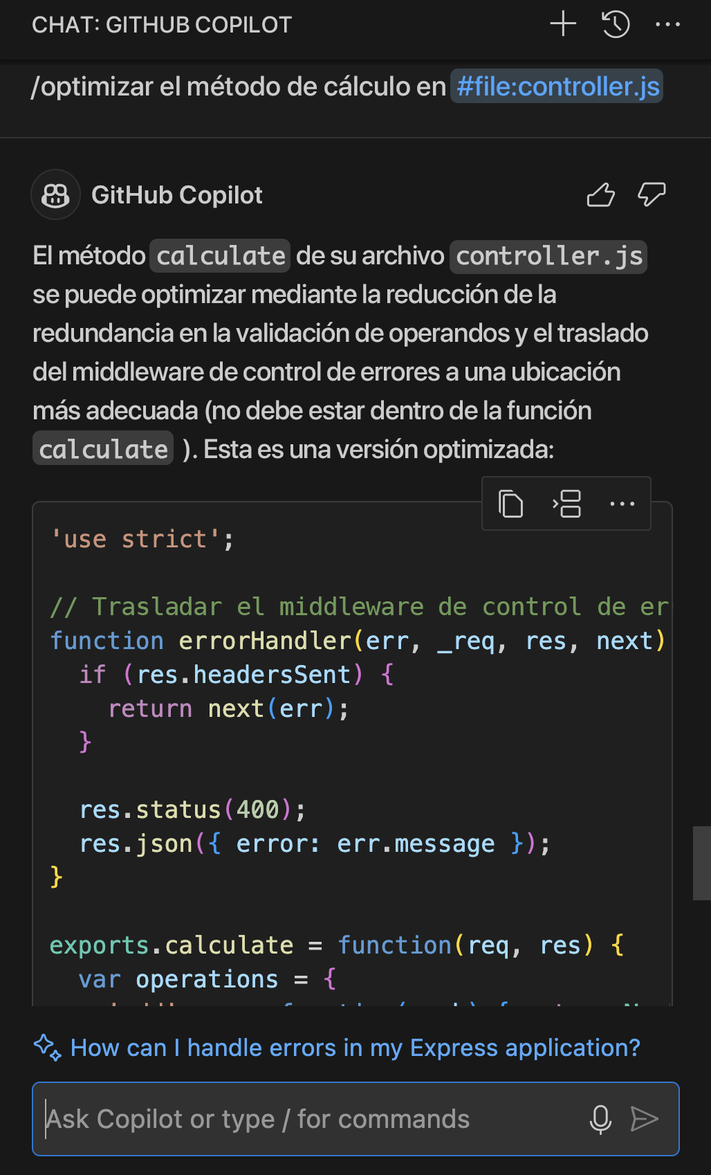 /optimize thecalcularmethod in controller.jsse centra en mejorar el rendimiento de ese método específico./tests: Crea automáticamente pruebas unitarias para el código seleccionado. Simplemente resalte el código y use