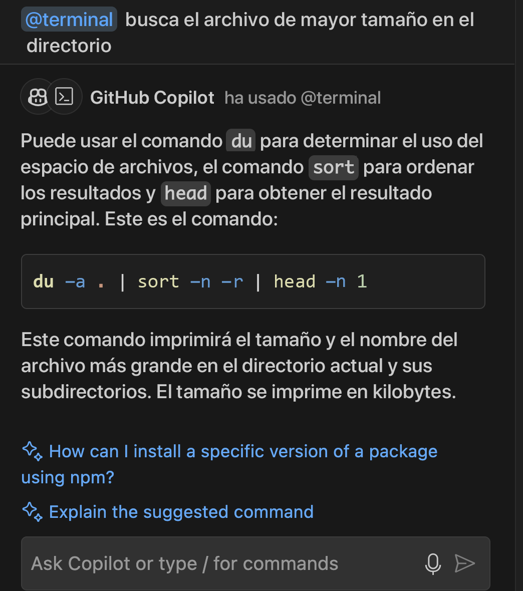 @terminal: este agente resulta útil para preguntas relacionadas con la línea de comandos. Por ejemplo, podría pedirle que encontrase el archivo más grande de un directorio o que explique sobre el último comando ejecutado.