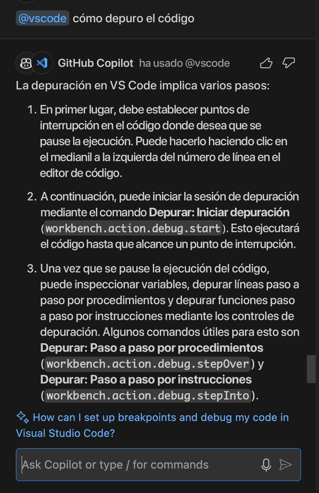 @vscode: use este agente para formular preguntas relacionadas con Visual Studio Code, como indicaciones sobre cómo depurar o cambiar la configuración del IDE.